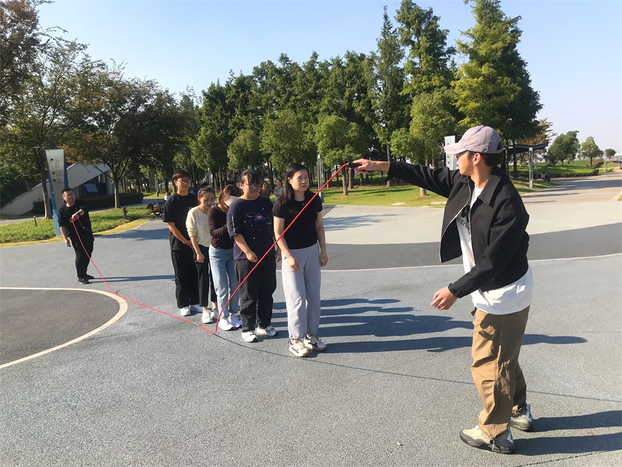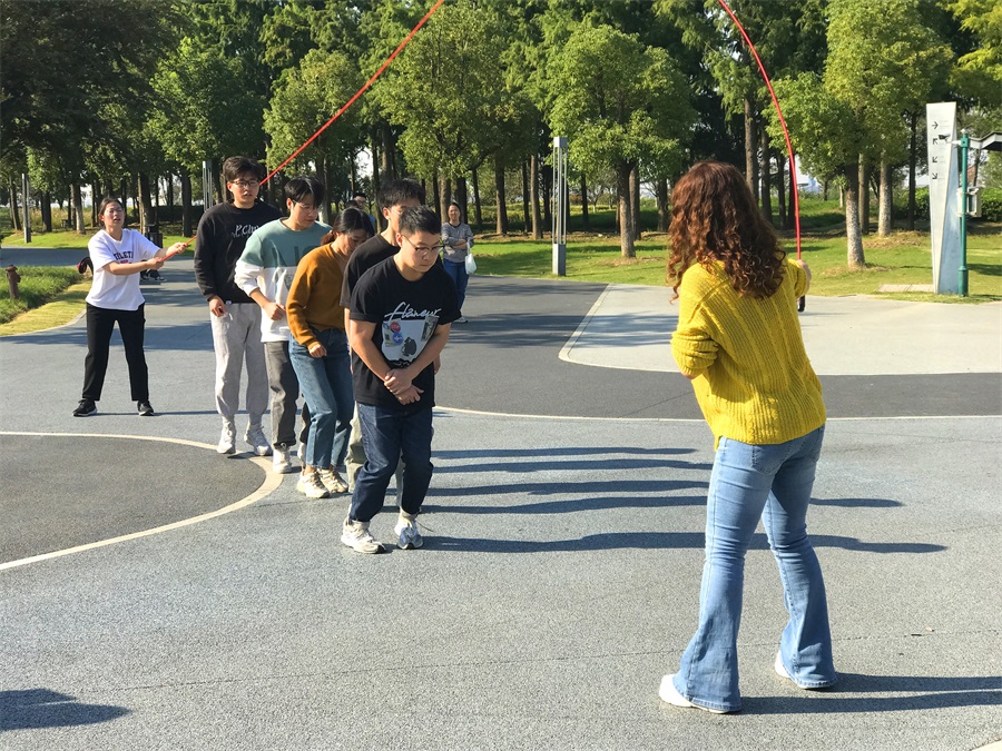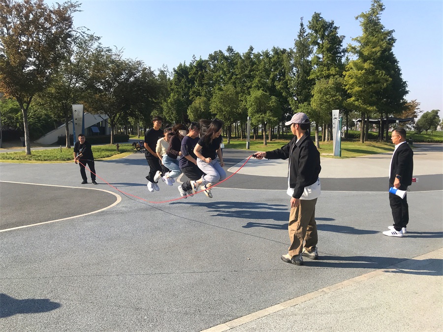 第二项活动:小组集体跳绳。根据抽签顺序,一组组进行,每个组人数相同,每组 7 人参加,其中选两个人专门负责甩绳,其余人站成一排,同时起跳,绳子需同时并成功穿过所有队员的脚底方可作为一个有效计数,在 3 分钟内,集体成功跳绳的数量多的小组获胜。