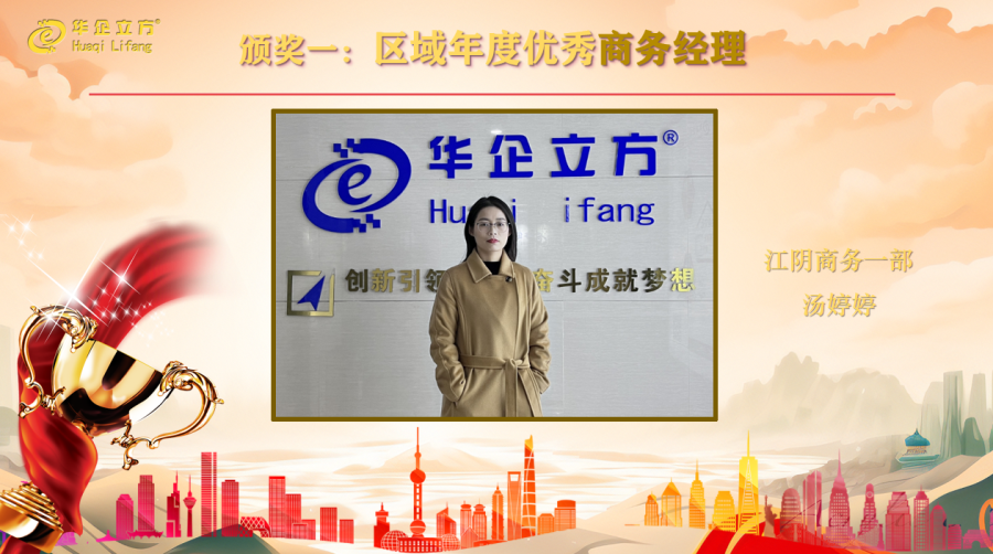 在江苏华企立方区域总监致开幕词之后,晚会正式开始。最先开始的是颁奖环节,2023年度区域优秀商务经理的获得者就是江阴商务一部汤婷婷,汤经理坚定的步履踏响成功的节拍,坚强的斗志创造绚烂的人生。扎实的工作,默默地付出;带领团队冲刺,她总能身体力行,奋勇向前,用激情的语言,拼搏的精神给人震撼。