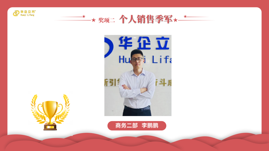 我们达到目标的唯一力 量就是坚持、坚持、再坚持。优秀的人之所以优秀,就是因为他与别人共处逆境时,别人失去了信心,而他却下定决心,实现了自己的目标,使我痛苦者必使我强大。获得1月份个人销售季军的就是华企立方商务部优秀男生之一,来自商务二部的李鹏鹏。